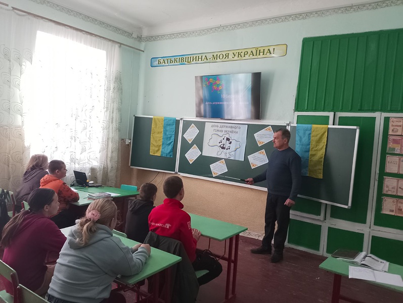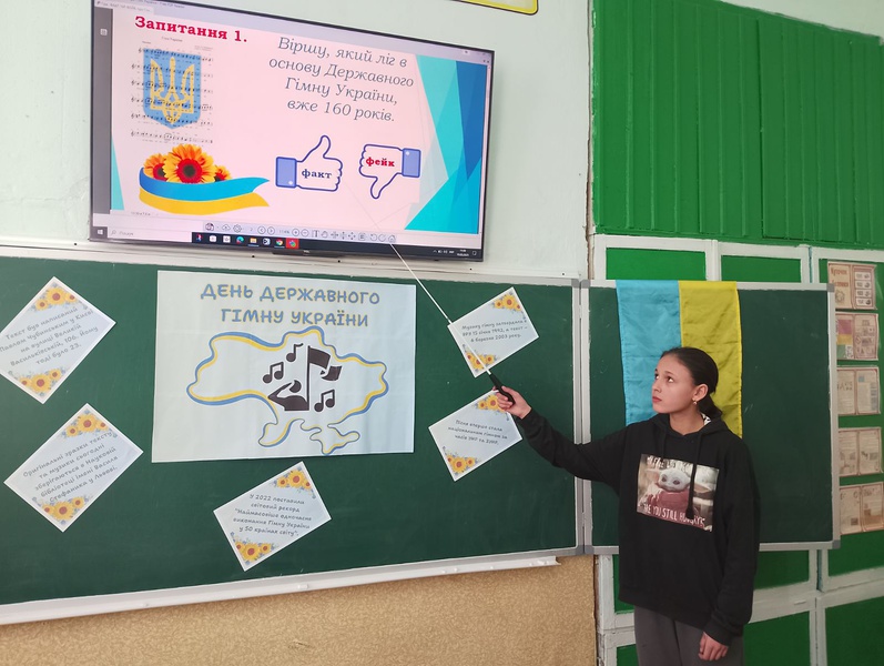 Поглибити знання учнів про символи України; ознайомити дітей із історією створення Державного Гімну України; сприяти пробудженню національної самосвідомості; формувати і розвивати почуття гордості за свій народ, країну з такою метою з учнями 7 класу було проведено годину спілкування до Дня Державного Гімну України «Гімн України в моєму серденьку» Під час заходу учні ознайомились про цікаві факти про державний Гімн та провели гру “Факт чи фейк”.