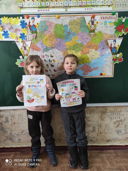 Напередодні Дня Соборності України учні 1 класу взяли участь у грі-вікторині «Моя Україна». Діти із зацікавленням знайомилися з державними символами та відкривали для себе значення слова «єдність». Маленькі серця — з любов’ю до України💙💛